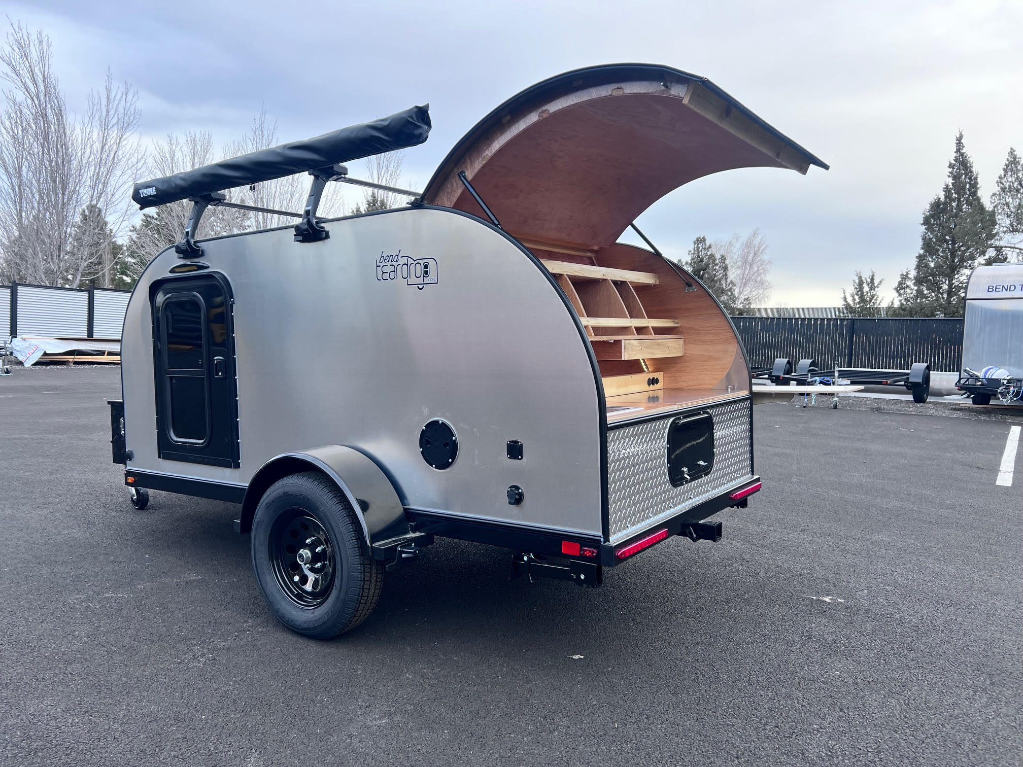 Loaded 5x10 Bend Teardrop Camper ready to roll! This fully insulated Teardrop Camper is ultra-lightweight only 1,200lb and can be easily moved around by hand. It comes on a 13" high-clearance axel profile with 15" full sized highway speed wheels and tires. This is an upgraded version of our 5x10 with lots of extras. It's versatile queen-sized cabin sleeps 2 1/2 with a 58.5"x30" kids bunk that can convert into a 58.5"X15" shelf to open up the space and accommodate couples as well as small families.