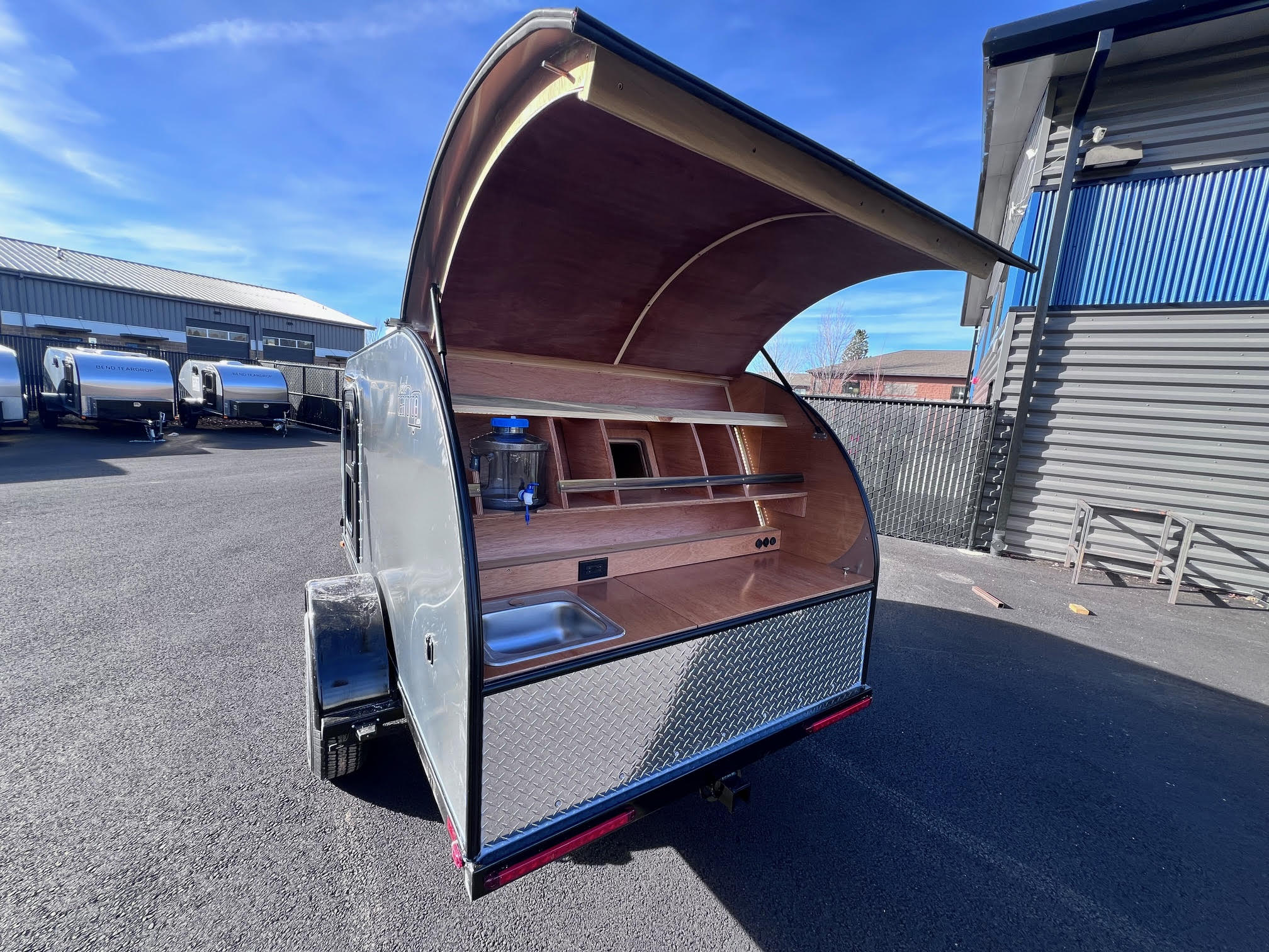 This 5x10 Bend Teardrop Camper sleeps three and a half comfortably with a Queen-sized floor and 58.5"x30" kids bunk that can slide back to open up the cabin for couples. Outdoor Galley Kitchen included! This ready to roll Teardrop only weighs 1,200lb and can be towed by almost any vehicle with a hitch and can even be moved by hand. This one comes with most of our most popular add-ons but can be further customized to meet your needs. It comes with:
